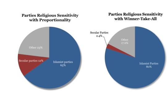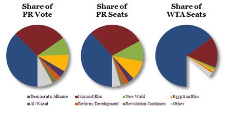 The Egyptian election was especially distinguished by the Islamist parties’ overwhelming victory, which won a collective landslide majority of seats. While preferences for Islamists was high, the winner-take-all system greatly exaggerated them. For example, the secular parties won 12% of the proportional representation seats, but only 2.4% of the winner-take-all seats, while Islamist parties won 65% of the PR seats and 80% of the winner-take-all seats.
