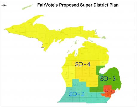 To make independent redistricting work, we need to replace winner-take-all elections that disadvantage those in the minority with geographically compact “super districts.” In each super district, several representatives would be elected with a proportional voting system like choice voting. Under our proposed plan, Michigan would be divided into four super districts with five seats in Super District 1 (SD1) and three each in SD2, SD3 and SD4. Each district would have the same number of seats per person. (The United States has a long history of multi-seat district elections based on this apportionment principle -- e.g., a Maryland House of Delegates district with three seats has three times the number of people as a House of Delegates district with one seat.)