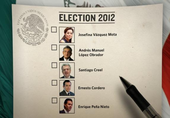 The 2012 presidential election in Mexico will be held on July 1 and pits the three major-party candidates against one another: Enrique Peña Nieto of the PRI, Andrés Manuel López Obrador again of the PRD, and Josefina Vázquez Mota of the ruling PAN. Mr. Peña Nieto has led most polling since November 2011, followed by 2006 near-winner Mr. López Obrador and Ms. Vázquez Mota battling for second place.