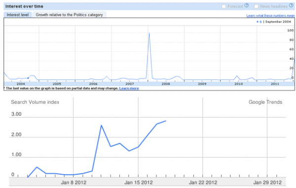 Just take a look at the two charts below that show a general news trend of interest in South Carolina voters and politics. The 2008 spike in interest in South Carolina and its voters is quite noticeable, but so too is the four-year drought in between presidential elections. Now, the cycle is just repeating itself again this month as interest in South Carolina climbs back up during this year's primary season -- its inevitable decline on the horizon.