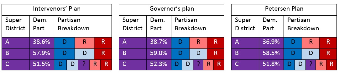 As these tables demonstrate, four very different maps, two partisan gerrymanders and two “fair” maps, all render the same results when combined into three and five-winner super districts with ranked choice voting. Each of them would render fair results and universally competitive elections.