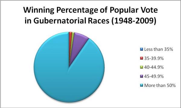 In a FairVote study of all gubernatorial general elections over a 62-year span (1948-2009) – 918 total races – it was found that in 90.4 percent of races, the winner received an outright majority of all votes cast.  Among the other races, 7.2 percent were won with 45-49.9 percent of votes cast, 1.1 percent were won with 40-44.9 percent of votes cast, and 1.3 percent were won with 35-39.9 percent of votes. No races were won with less than 35 percent of the total vote.  Most recently, of the 16 gubernatorial general elections nationwide between 2007 and 2009, one (Christopher Christie of New Jersey in 2009 – 48.8 percent) was won with less than an outright majority of votes.